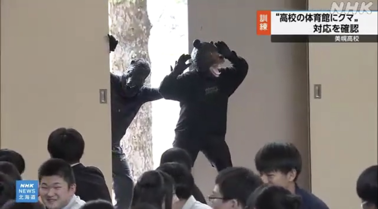 北海道・美幌町の高校でクマ出没を想定した訓練 クマに扮した警官登場するもこんなん笑うに決まってる