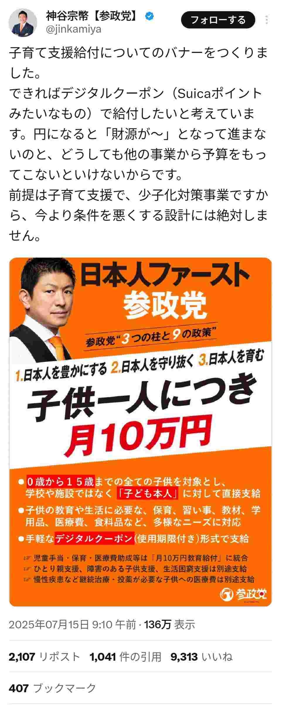 参政党「子ども月10万。円ではなくポイントで給付するので財源は心配しなくてOK」