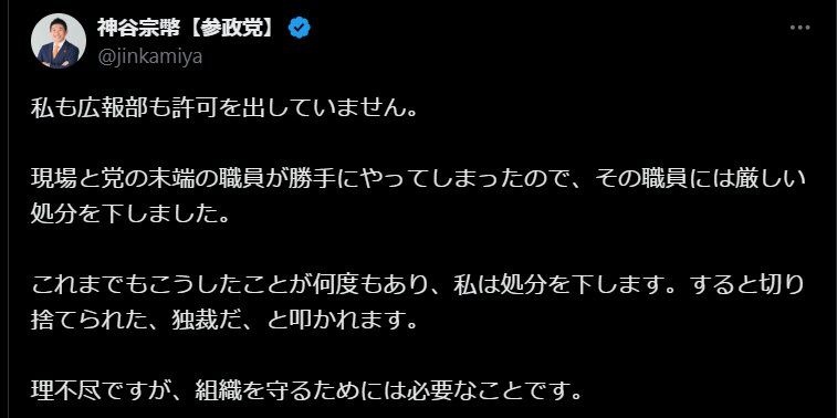 「7月14日にはロシア国営メディア『スプートニク』のXアカウントに、東京選挙区の参政党候補、さや氏のインタビュー動画が投稿され、『参政党はロシアのプロパガンダに利用されているのでは』として波紋を広げました。神谷氏は自身のXに〈私も広報部も許可を出していません。現場と党の末端の職員が勝手にやってしまったので、その職員には厳しい処分を下しました〉と投稿するなど、釈明に追われました」(政治部記者)