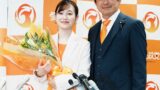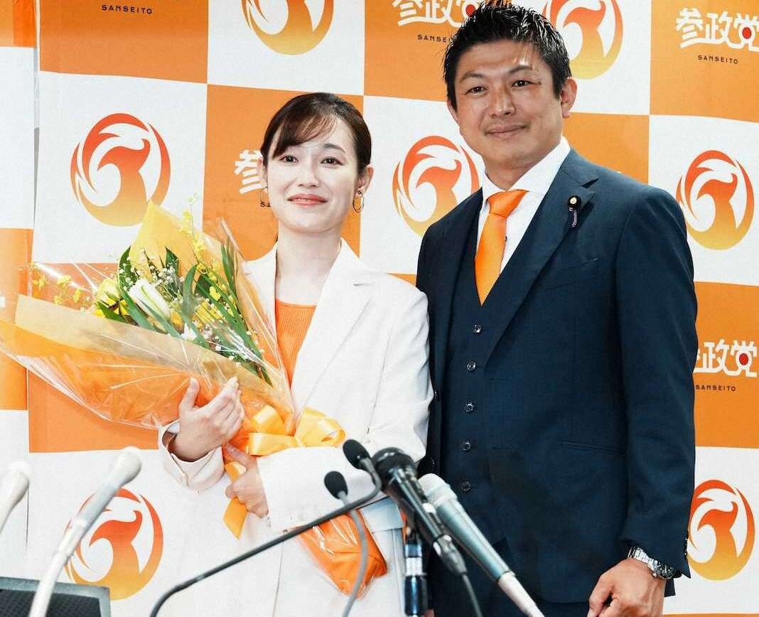 【写真】当選確実となったさや氏と花つけする参政党の神谷宗幣代表