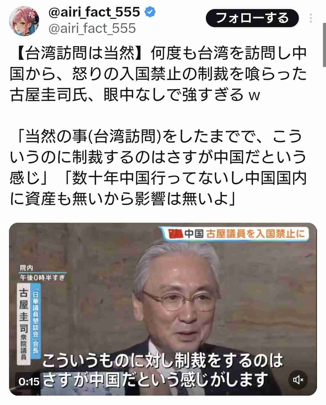 古屋氏「当然の事(台湾訪問)をしたまでで、こういうのに制裁するのはさすが中国だという感じ」