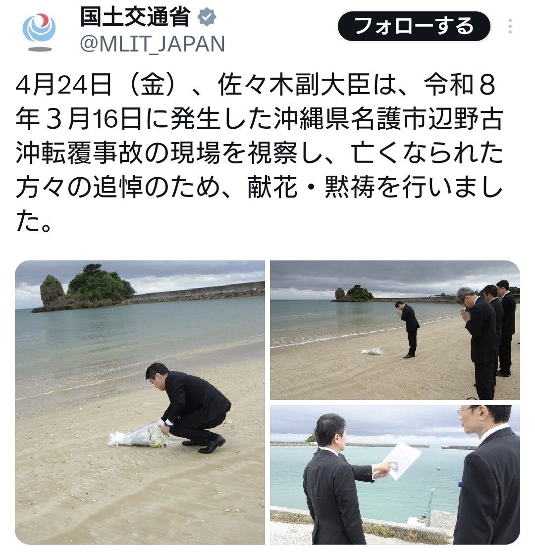 国土交通副大臣、辺野古の事件現場で献花。事件究明に向け強い決意
