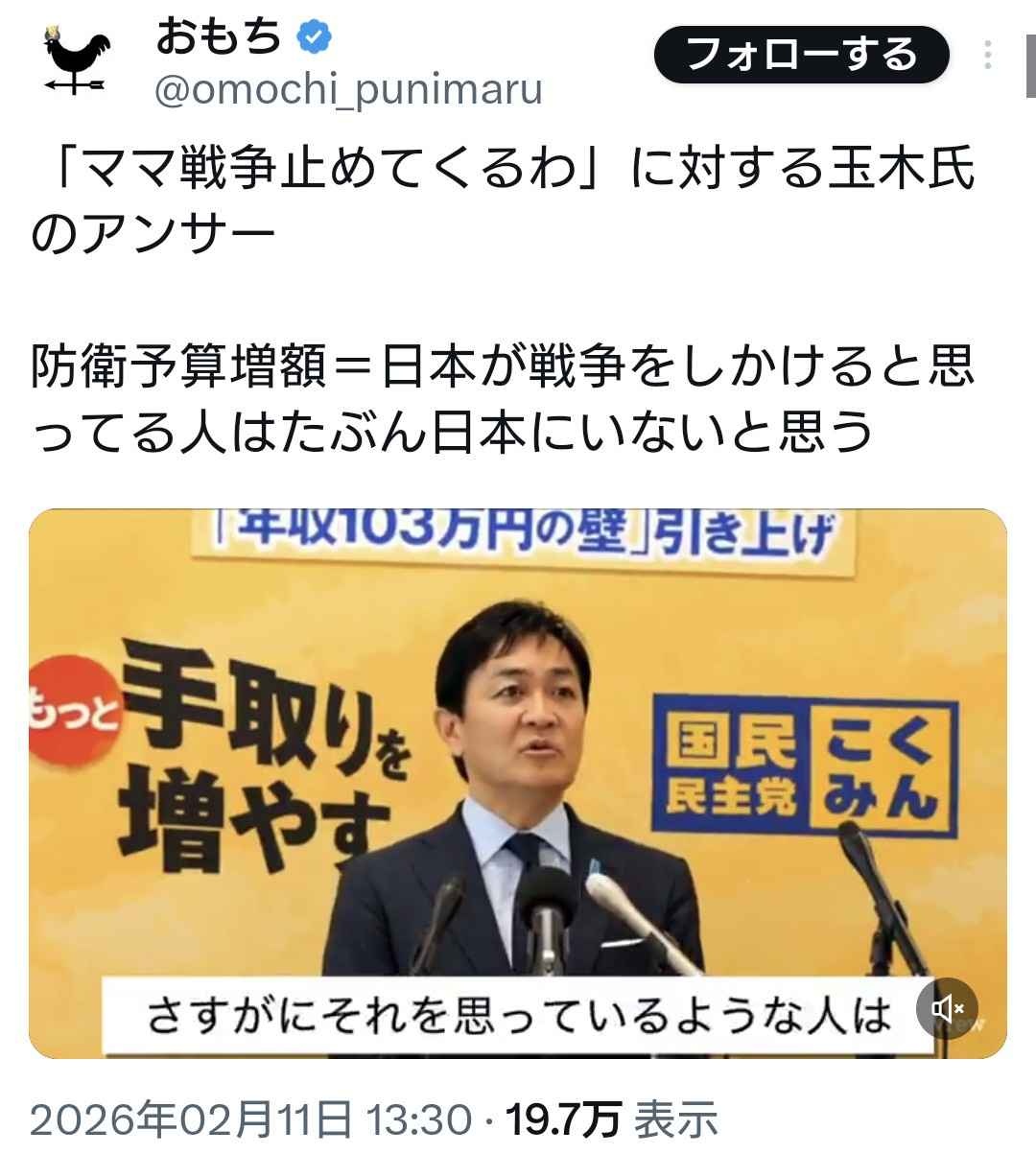 国民・玉木氏「防衛予算増額=日本が戦争をしかけると思ってる人はたぶん日本にいないと思う」