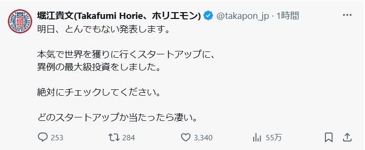 「明日、とんでもない発表します」と前置きした上で「本気で世界を獲りに行くスタートアップに、異例の最大級投資をしました。絶対にチェックしてください」と記述。最後に「どのスタートアップか当たったら凄い」と締めくくった。堀江氏の投稿に対し「世界取るならアニメ、ゲーム関連かな」「マグロ釣りのため遊漁船を買ってくれませんか?」「堀江さんが“本気で世界獲る”って言ったら、普通のスタートアップじゃない気がする。AI領域ならAlt、現場改革ならTelexistence。あとは教育DAOとかも堀江さん好きそ」などと書き込まれていた。