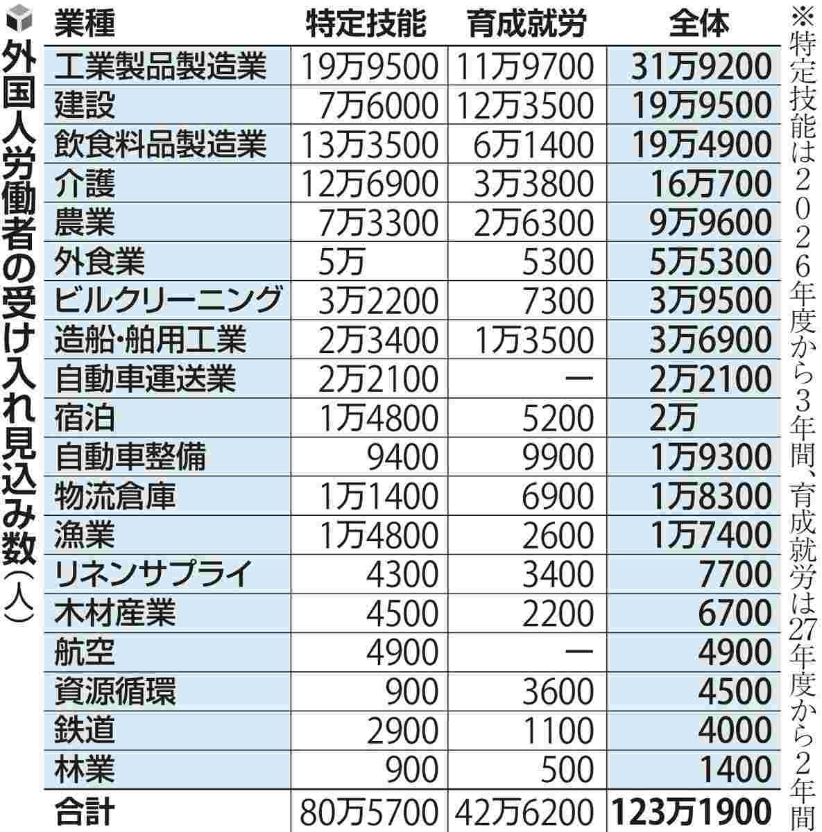 【読売新聞】 政府は23日午前、2028年度末までに最大で計123万1900人の外国人労働者を受け入れるとする上限案を有識者会議に示した。在留資格「特定技能」制度で約80万人、技能実習に代わって27年から開始する「育成就労」制度で約