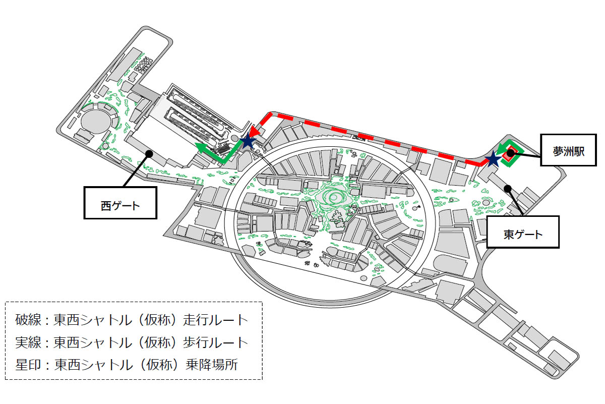 Osaka Metroは、東ゲートから西ゲートへのアクセス手段として、EVバスによる「東西シャトルバス(仮称)」を7月1日から運行する。料金は400円。