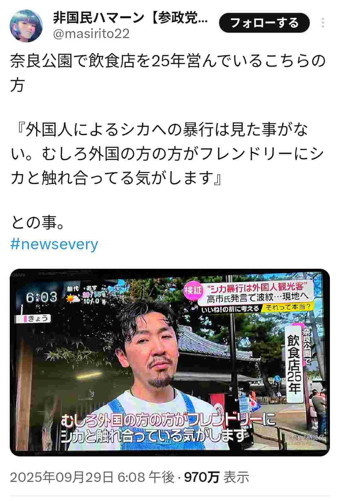 奈良公園で25年やってる飲食店「外人のシカ虐待見たことない」→高市支持者、GoogleMap低評価攻撃