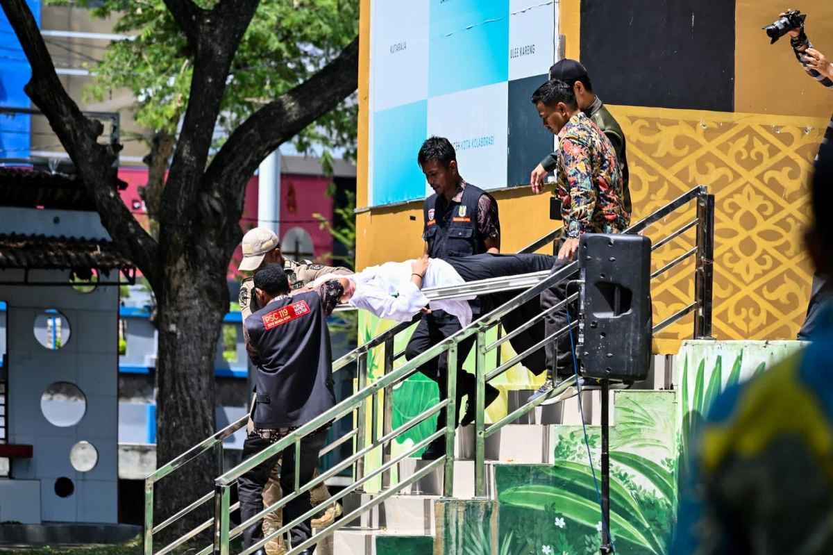 1月29日、バンダアチェでシャリア警察による公開むち打ち刑を受けた後に失神し、医療チームとシャリア警察の隊員に運ばれる女性(AFP via Getty Images)