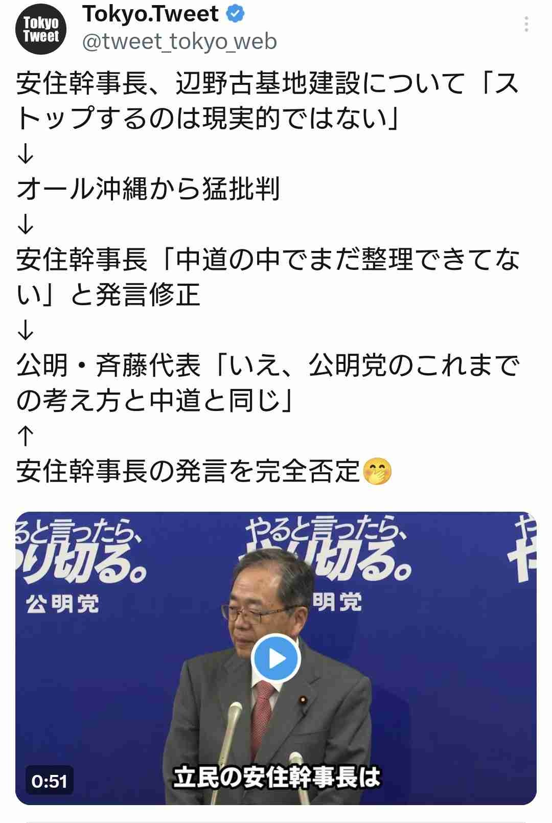 安住氏「辺野古移設について中革連内で整理がまだできてない」→斉藤氏「いえ整理済みですけど?」