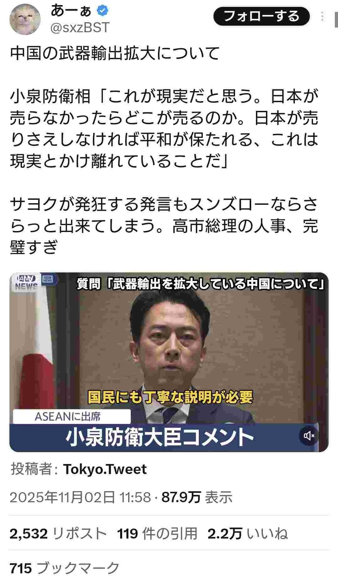 競合の支那朝鮮から見れば日本が武器輸出大国になったら商売の脅威だからな - 53 : 2025/11/02(日) 19:27:41.62 ID:DLS6lJtl0