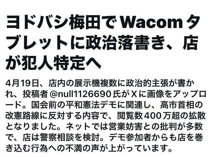 展示パソコンに「高市やめろ戦争反対」と書き込んだパヨクにヨドバシ梅田が激怒。犯人特定中