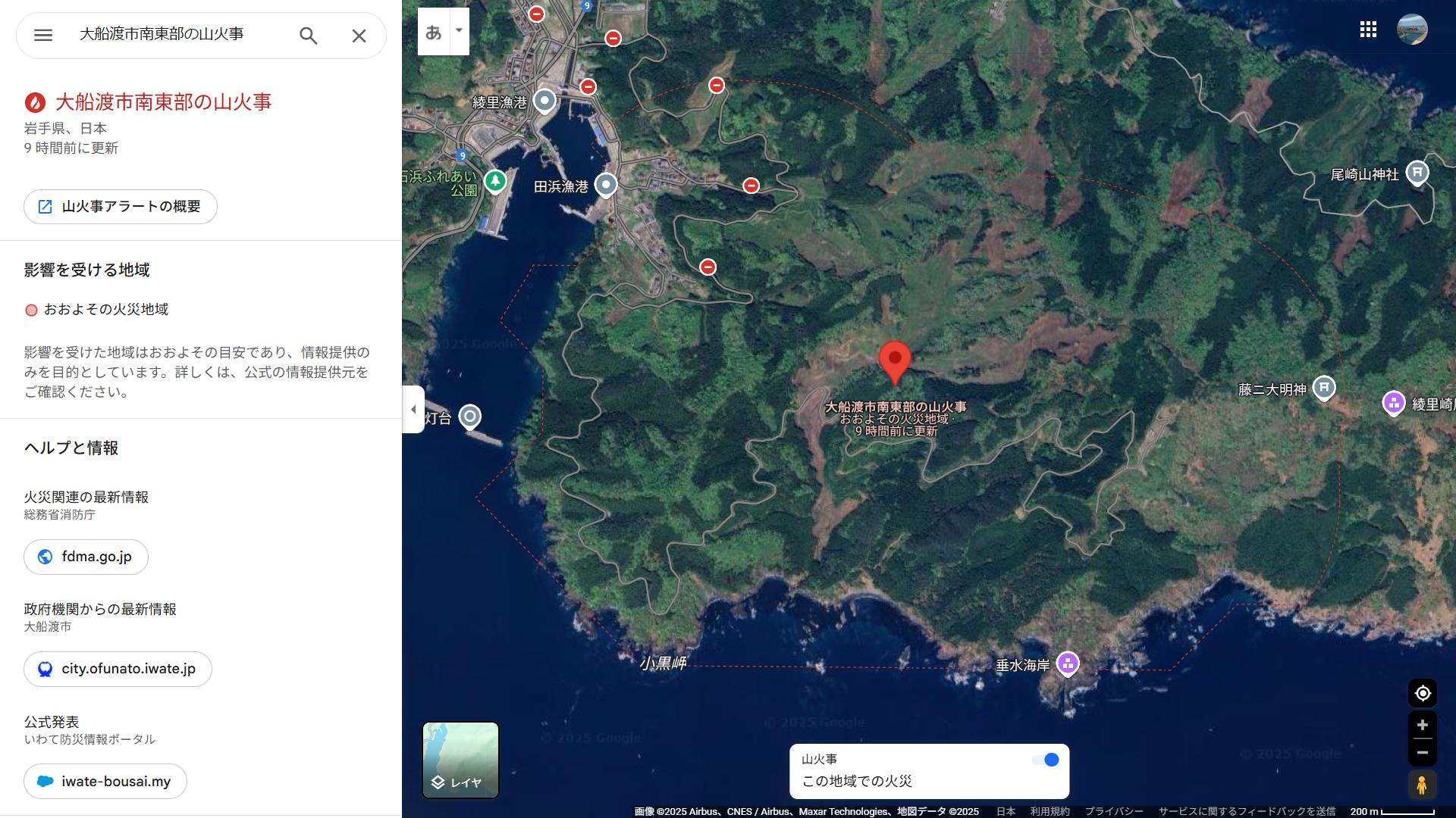 この15分後にとなりの陸前高田市で新たな山林火災が確認されると、火は大船渡市末崎町にまで達して約8haを焼き、26日正午に鎮圧したばかりでした。