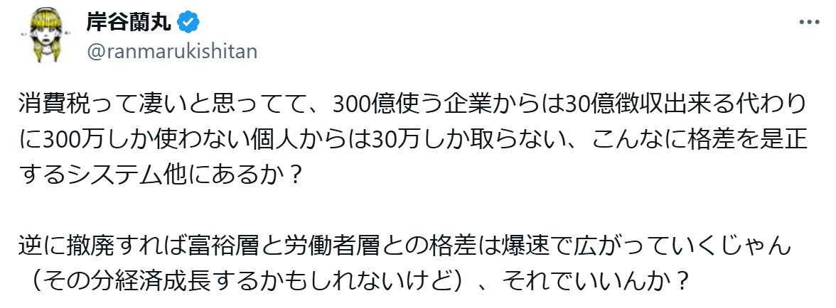 岸谷の主張に対し「正直、消費税は超公平だと思うので、絶対に廃止してはいけないと思います。反社、ヤクザ、政治家も、モノを買うなら確実に払わなきゃならない。消費税20%とかで全然よいので、社会保障料や所得税その他の確実にブン盗られる税金を減らし、かつ累進課税性にして実資産に応じた税収制度にしてほしい」「世代間格差が少しでもなくなるから俺は消費税よりもっと変えるべきところがあると思う」「>逆に撤廃すれば富裕層と労働者層との格差は爆速で広がっていくじゃん ワイも撤廃には大反対だけど仮に撤廃したとしても格差は大して広がらないと思う というより格差を広げないように代わりの財源として給与所得者が絞りカスになるまで絞りとるだけだから これは立憲でも自民でも全く同じ」などと書き込まれていた。