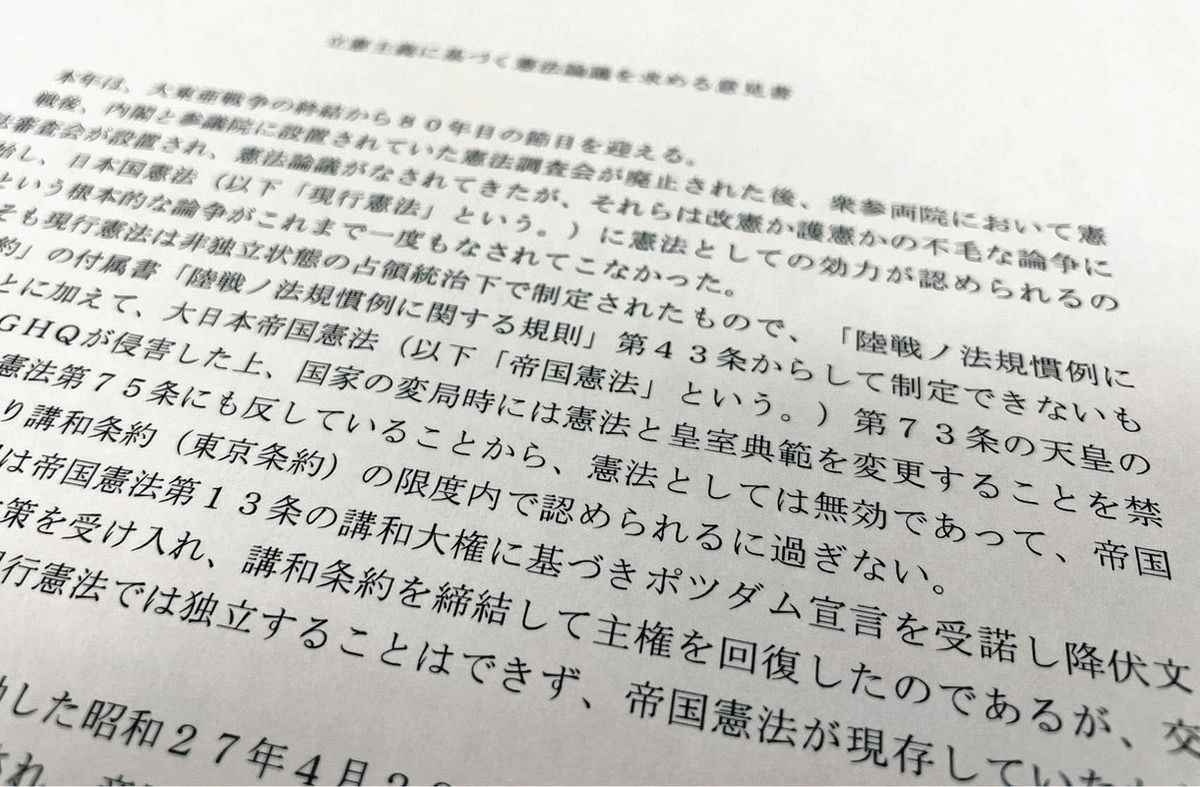 「憲法としては無効」などと記された意見書案三宅隆介議員は提案説明で、「現行憲法は帝国憲法で定めた天皇の改正発議権を連合国軍総司令部(GHQ)が侵害した上、国家の変局時の改憲を禁じる趣旨の帝国憲法75条にも違反して制定された」として「憲法としては明らかに無効」と主張。1952年のサンフランシスコ講和条約による主権回復も「帝国憲法が現存していたからこそ独立できた」などと述べた。