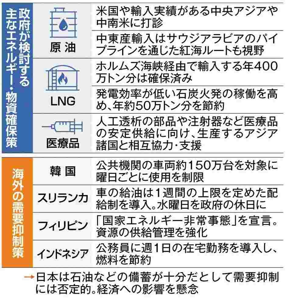 海外では車の使用規制などに踏み切る国も出ているが、政府は備蓄があるとして代替ルートによる石油製品の確保などを急ぐ構え。