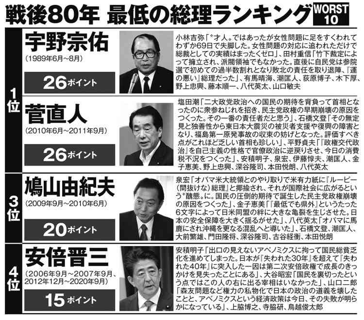 《戦後80年》「最高の総理」「最低の総理」ランキング ワースト1位は同点で菅直人氏と宇野宗佑氏、ワースト10は「失われた30年」の総理が占める