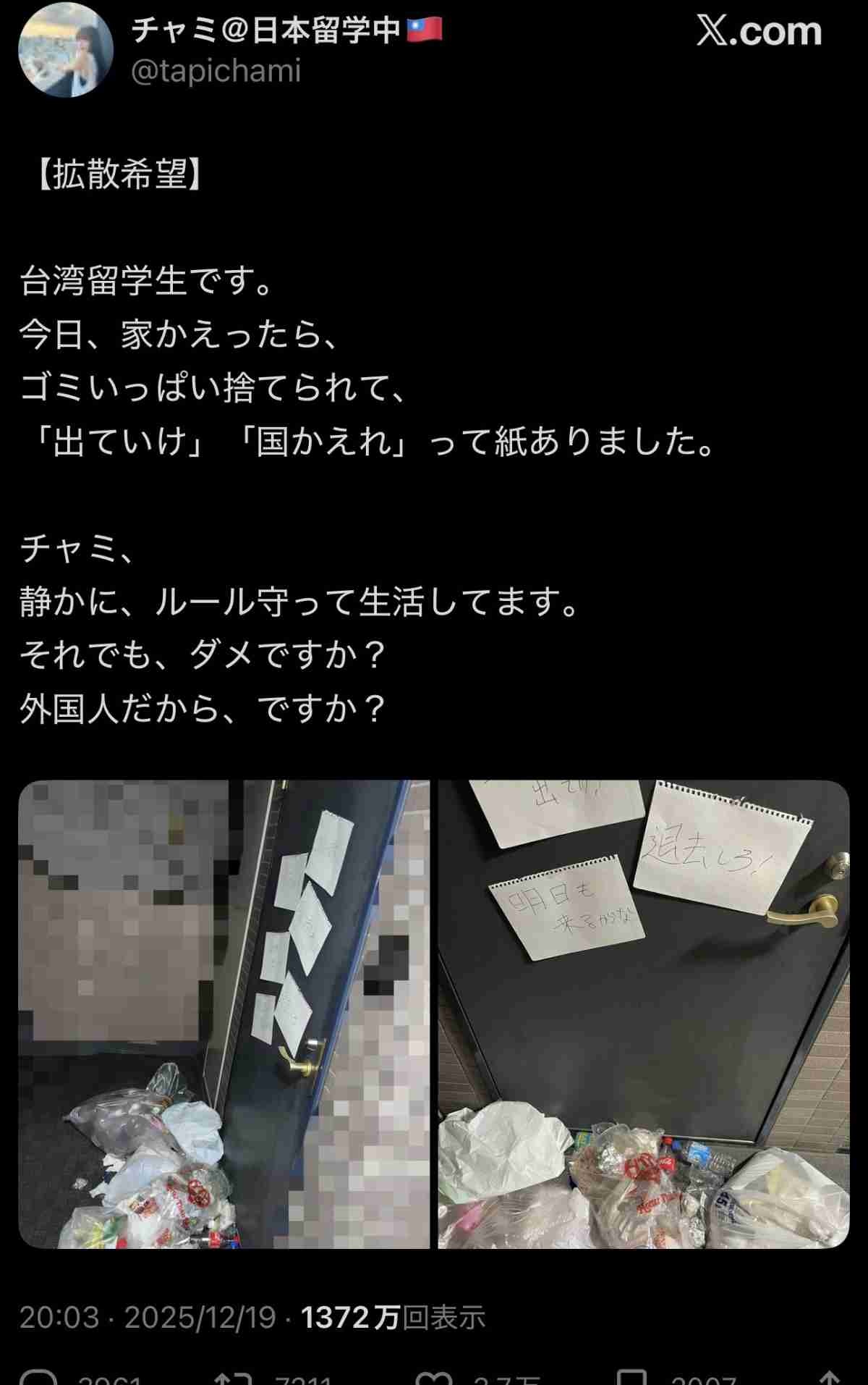 日本人、一線を越える。台湾人留学生のマンションに「日本から出て行け」と貼り紙をはりゴミを撒く