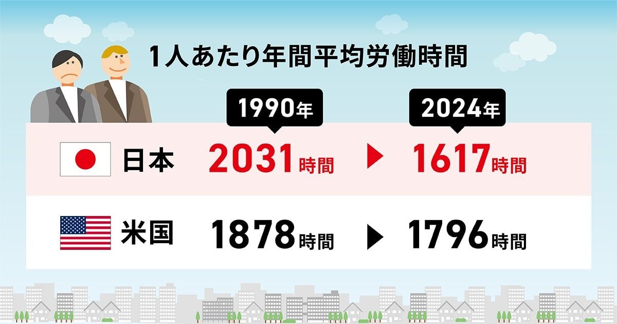 厚生労働省の毎月勤労統計は1人あたりの所定内と所定外を合わせた「総実労働時間」を公表している。1990年時点では年平均2064時間、月平…