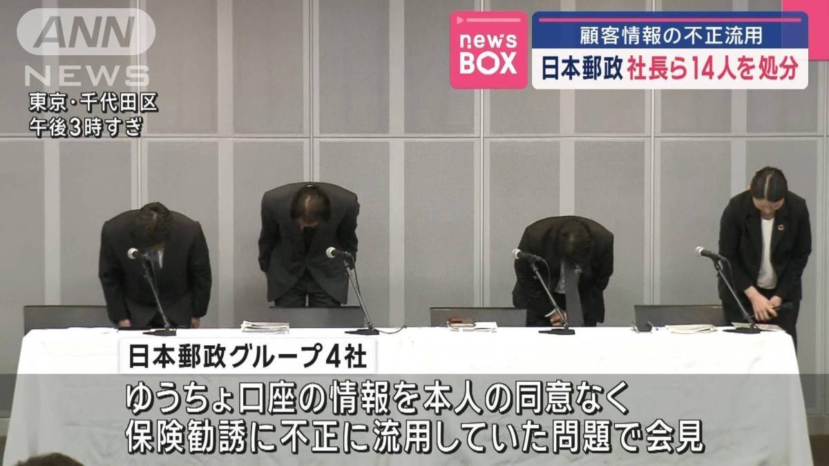 日本郵政グループ4社は18日午後に会見を行い、ゆうちょ口座の情報を本人の同意なく保険の勧誘に不正に流用していた問題で、14人の役員報酬を最大で30%、3カ月減額とする処分を発表しました。
