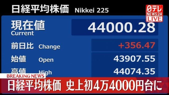 日経平均株価 史上初4万4000円台に