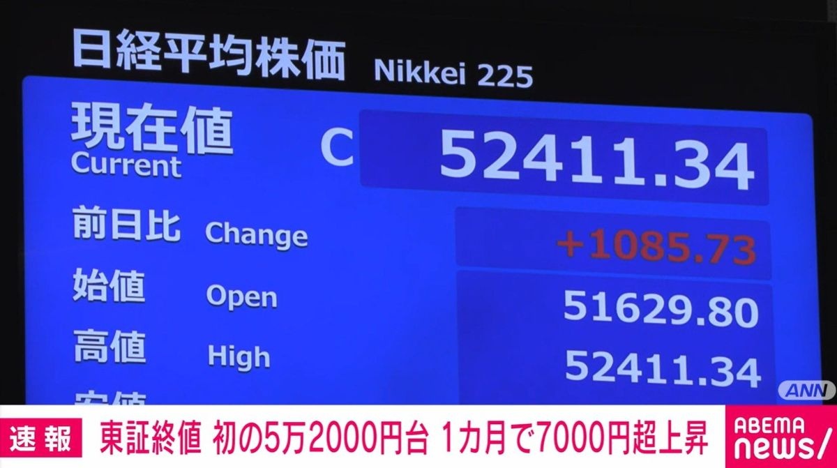 31日の日経平均は、午前の取引から大きく上昇し、史上初めて5万2000円台にのせました。