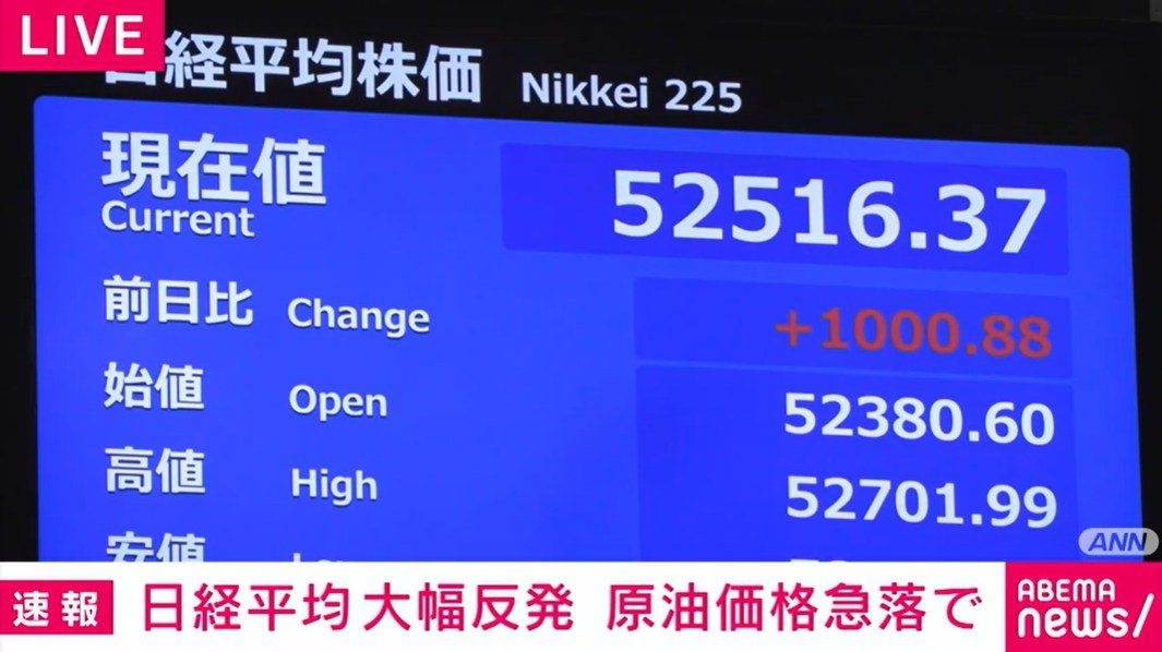 きのう大きく値下がりした日経平均株価は原油価格の急落により大幅に反発しています。