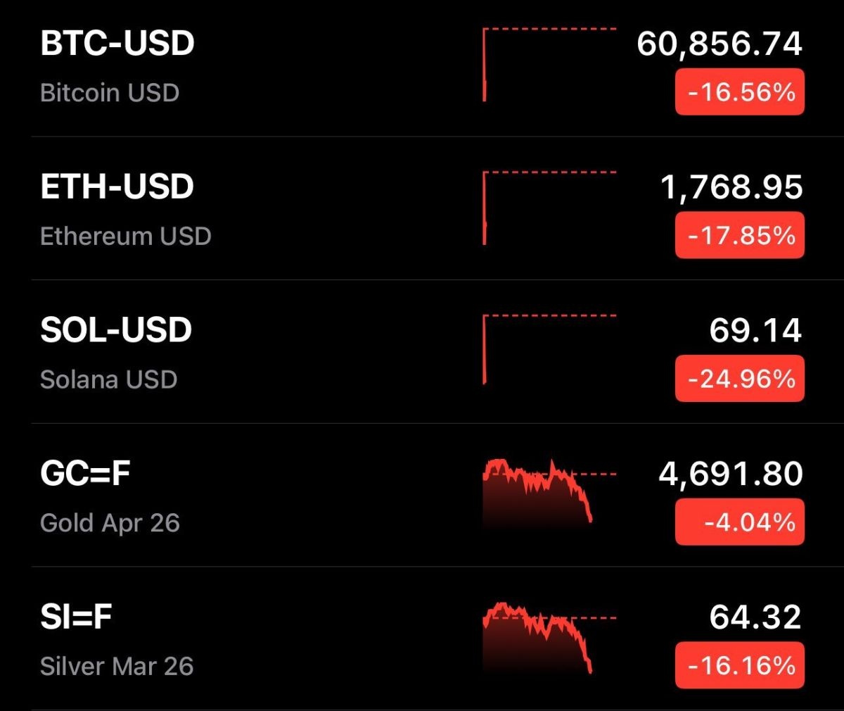 本日の最安値時点で、暗号資産、金、銀の市場全体の時価総額は、合計で約2兆4,000億ドルも減少した。