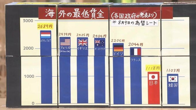 ちなみに、海外の先進国の最低賃金を円換算(8月9日の為替レート)で見てみると、最も高いルクセンブルクは2689円。アメリカ(カリフォルニア州)、イギリス、オーストラリアも2400円程度で続き、それよりは低いドイツやフランスでも、日本と比べて2倍ほどになっています。日本と同程度なのは、韓国です。日本より賃金の高い国々は物価も日本より高いわけですが、今回、日本で6%という高い引き上げ幅となった背景にあるのも物価高です。