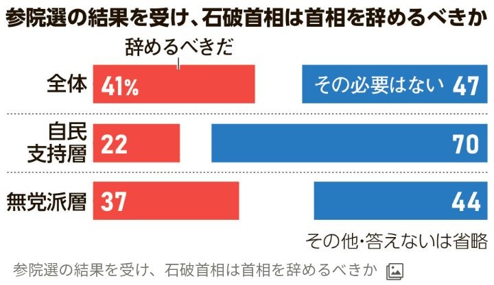 朝日新聞社が7月26、27の両日に実施した全国世論調査(電話)で、参院選の結果を受けて石破茂首相が辞めるべきか尋ねたところ、「辞めるべきだ」が41%で、「その必要はない」の方が47%とやや多い結果になった。