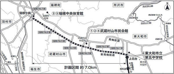 現在の北の終点、上北台駅(東大和市)から約7.2km北西へ、JR八高線の箱根ヶ崎駅(瑞穂町)へとつなげるプロジェクトです。大部分は新青梅街道沿いに建設されます。