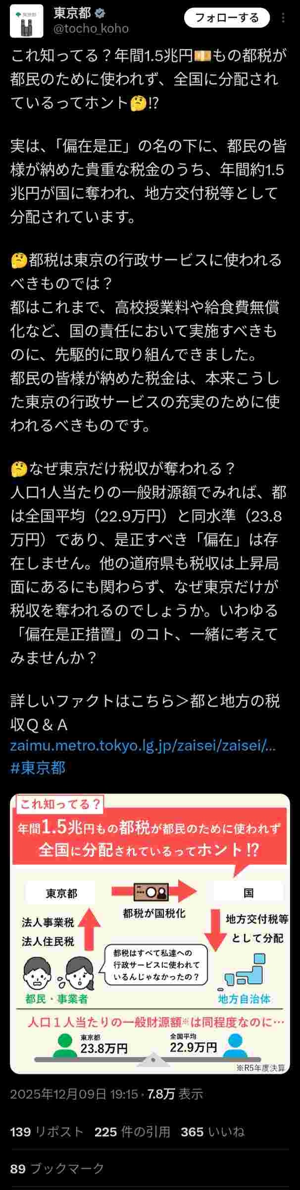 「都民の税金が国に奪われている」。東京都の公式アカウントが投稿した、そんな嘆きのポストが物議を醸しています。都としては「財源を不当に持っていかれている」という主張ですが、ネット上では「地方のリソースにタダ乗りしているのはどっちだ」という怒りの反論が殺到。なぜ、この投稿はこれほどまでに人々の神経を逆撫でしてしまったのでしょうか。【画像】「え、ホントに公式が言ってる…!?」SNSで物議を醸した公式投稿をみる