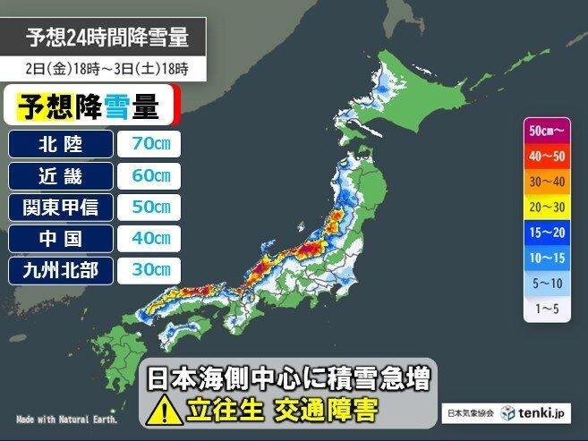 日本海側を中心に雪が降り続いていますが、今夜から明日にかけて東京都心でも雪が降りそうです。また、明日3日(土)の夕方までに北陸の多い所ではさらに70センチの雪が降ることが予想されます。Uターンの足に