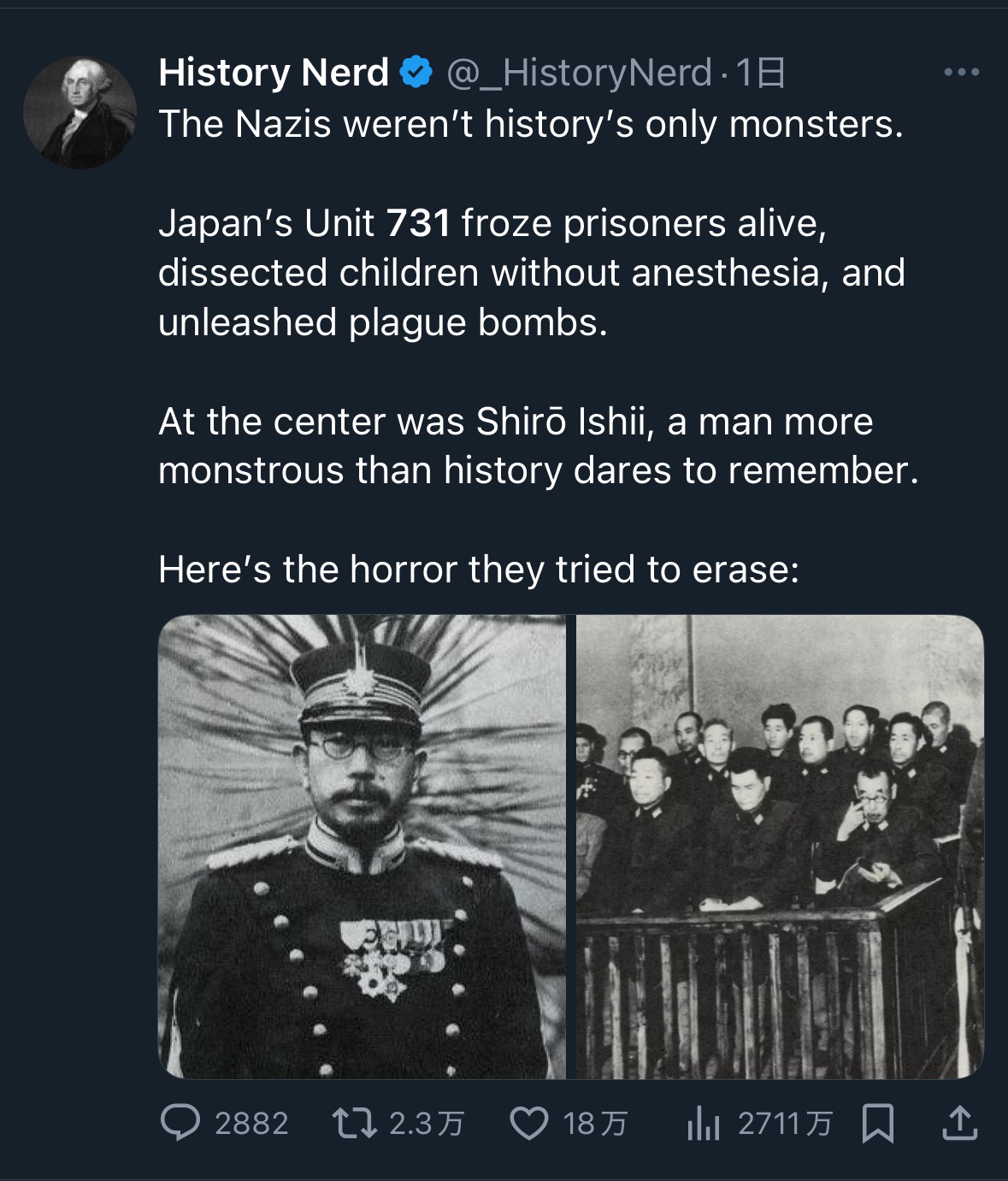 欧米歴史学者「731部隊はナチスより残忍。捕虜生きたまま冷凍、子供麻酔なしで解体」→18万いいね