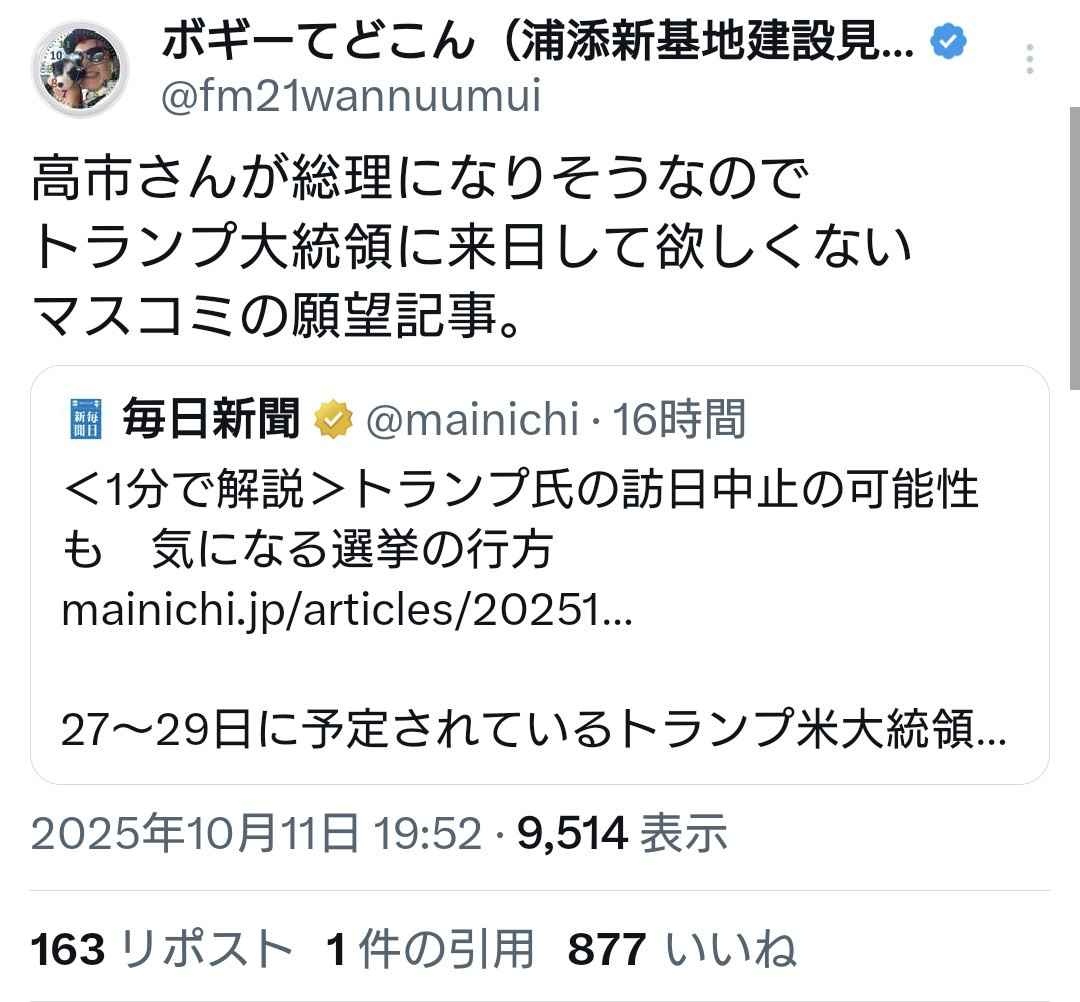 毎日新聞(オールドメディア)「トランプ氏の訪日中止の可能性(単なる願望)」