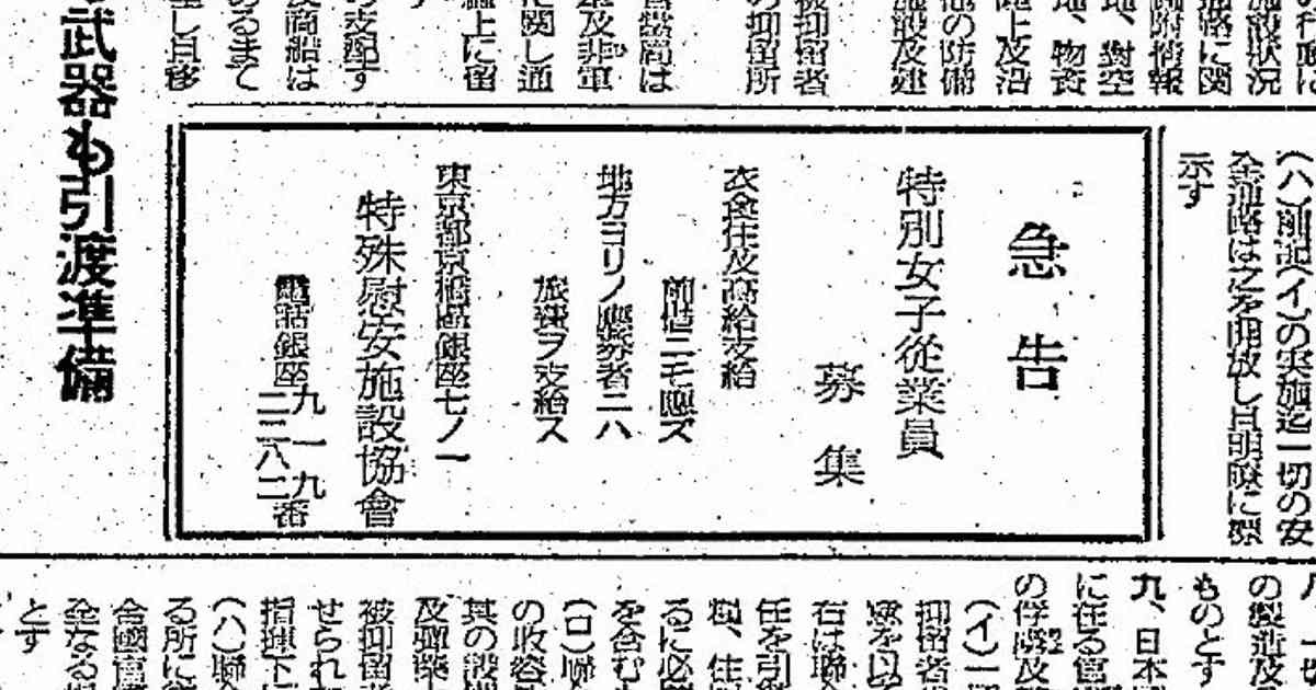 政府は、占領軍が「一般の婦女子」に性的暴行に及ぶことを防ぐには、「性の防波堤」となる慰安施設が必要だと判断。数万人もの女性を動員し、「女の特攻」と呼んで性産業に従事させた。