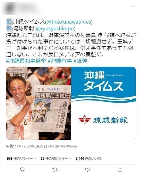 沖縄県知事選候補者の佐喜真淳氏が26日に那覇市内で演説中、複数の薬きょうのようなものが投げつけられた件について、短文投稿サイトのツイッター上で「沖縄地元二紙は(中略)一切報道せず」とのつぶやきが26日午後11時に投稿された。