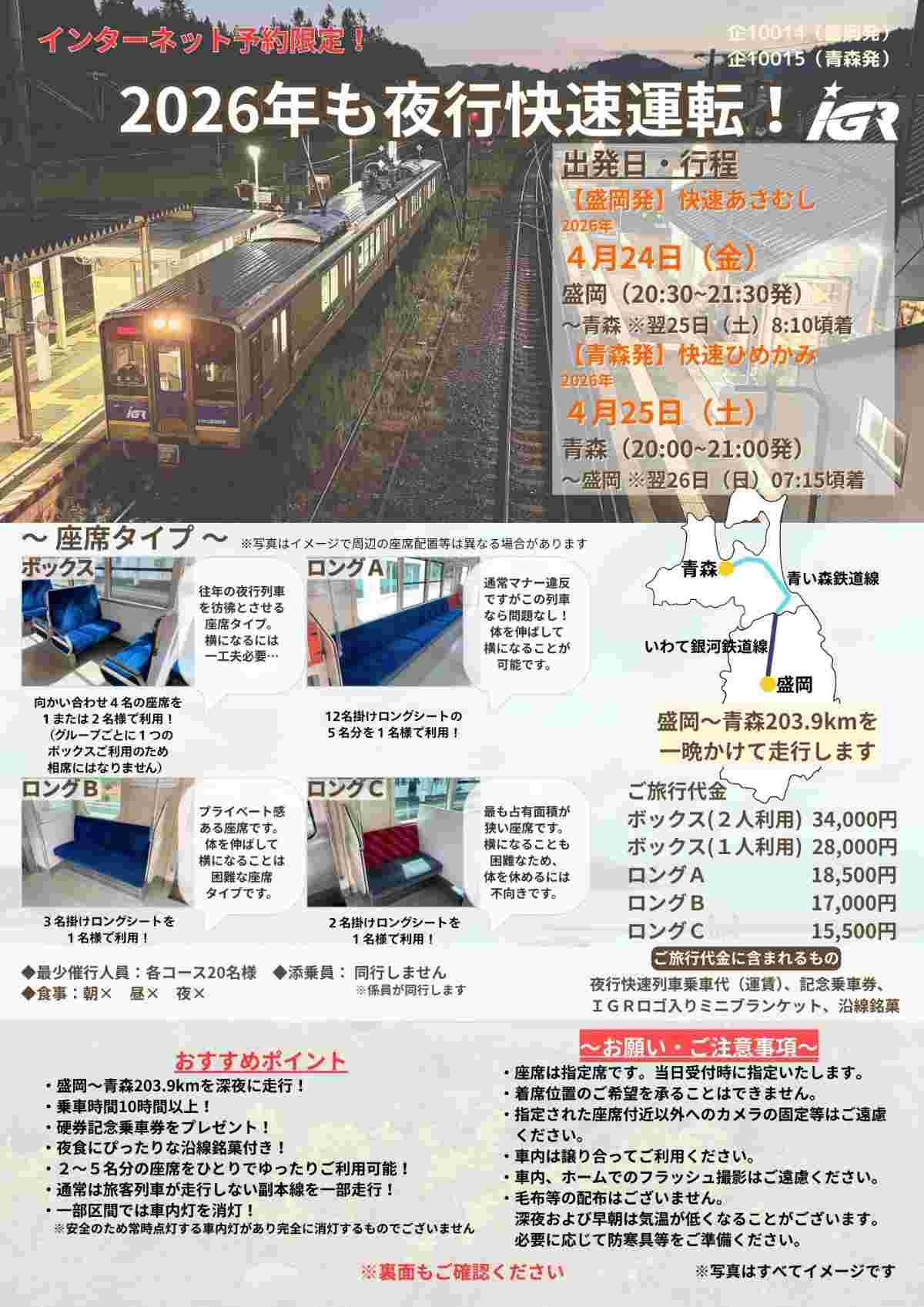 IGRいわて銀河鉄道は、ツアー「団体臨時夜行快速あさむし・ひめかみ」を2026年4月24日(金)~25日(土)にかけて開催します。