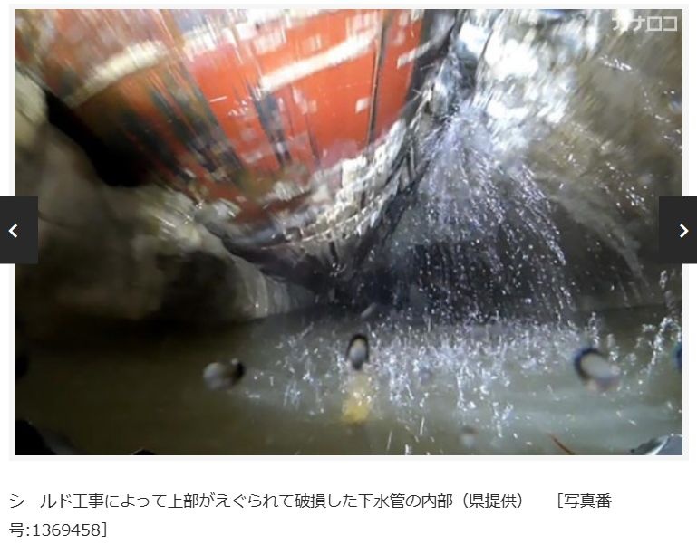 県が1、2日にカメラで管の内部を調査したところ、シールド工事によって管の上部がえぐられ、破損しているのが確認された。復旧のめどは立っていないという。