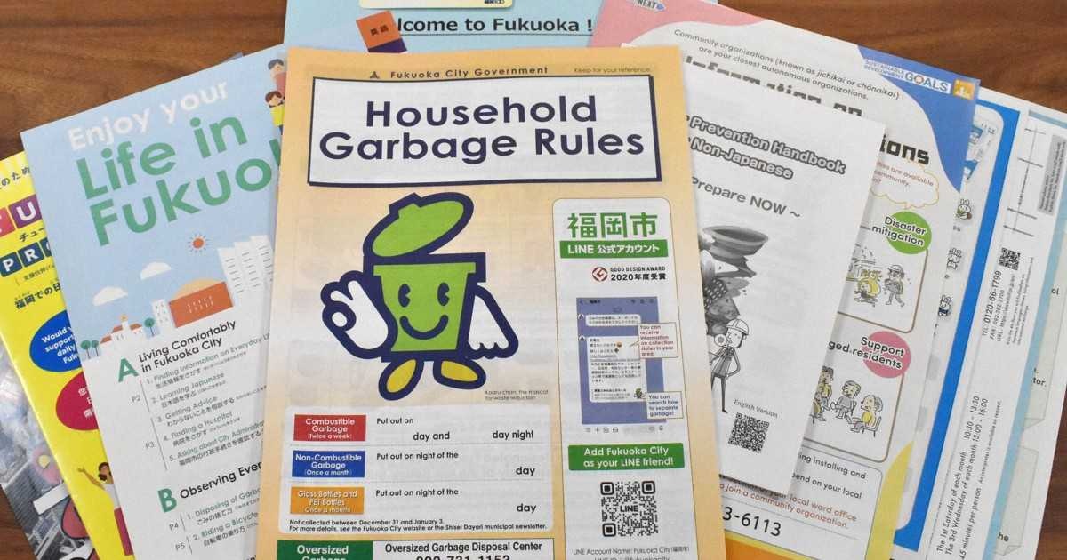 福岡市のウェルカムキットには、外国人に向けたゴミ出しのルールや防災ハンドブック、相談支援センターの番号などが書かれた冊子が入っている=福岡市博多区で2025年12月16日午後5時22分、山崎あずさ撮影