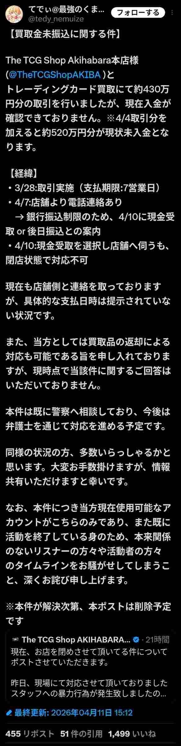 秋葉原に今年3月グランドオープンしたばかりのトレカショップ「The TCG Shop AKIHABARA本店」が、わずか2ヶ月で事業停止に追い込まれ、自己破産申請の準備に入った。運営会社の株式会社The TCGは負債約2億円、債権者約200名規模と発表。公式文書でトレカ相場変動を原因に挙げたが、SNSでは高額買取を餌にカードを集め、買取代金を支払わずに逃げた疑いが噴出。