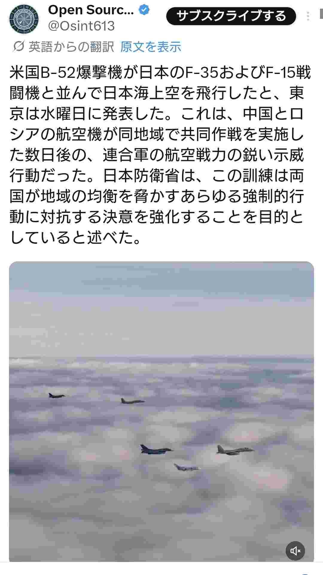 米軍のB-52爆撃機と日本のF-35戦闘機、F-15戦闘機が日本海上空で並んで飛行する様子がこちら