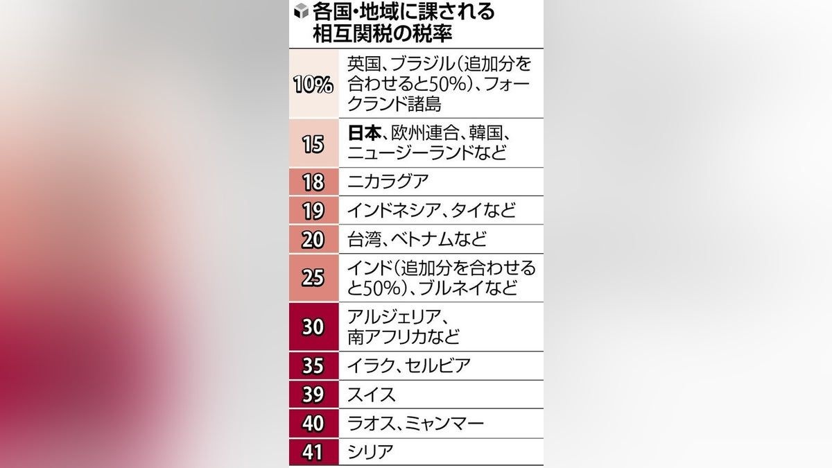 赤沢氏は5日夜、ワシントン近郊で「合意前後を含めて米側の閣僚から聞いている説明と違う内容になっている」と記者団に述べた。日本政府の説明によると、もともと関税率が15%未満だった輸出品は一律で15%となり、15%を超える関税が課されていた品目は従来の税率が適用される仕組みで合意した。