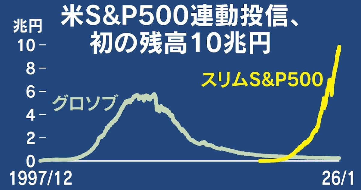 個人投資家の間で株価指数に連動する投資信託が人気だ。米S&P500種株価指数との連動を目指す投信の運用残高が7日、公募投信として初めて10兆円の大台に乗せた。起点は2024年に始まった新NISA(少額投資非課税制度)。物価高の定着で将来の不安も募るなか、保有コストの低い同投信に資金が流入。「貯蓄から投資」の波が広がる。