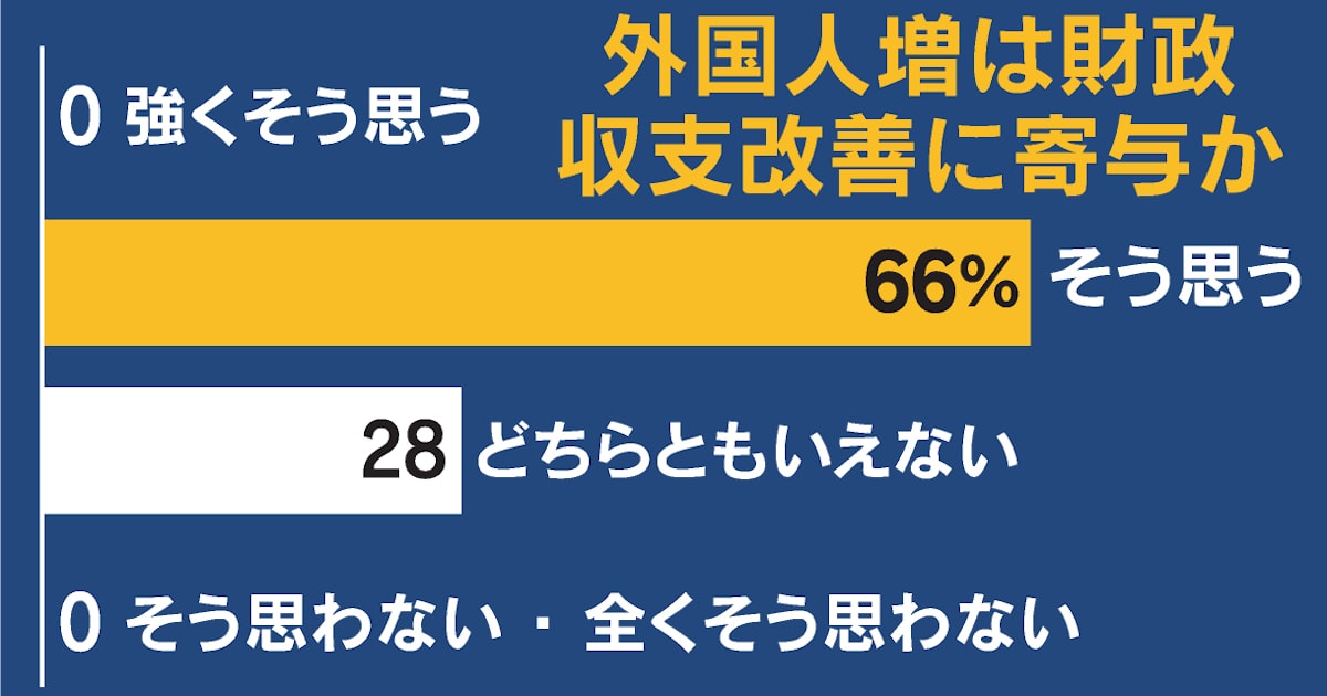 在留外国人が増えることで財政収支が改善するとの見方が66%に上った。若い外国人労働者が人手不足を補完し、税や社会保険料の支払いも大きいためだ。