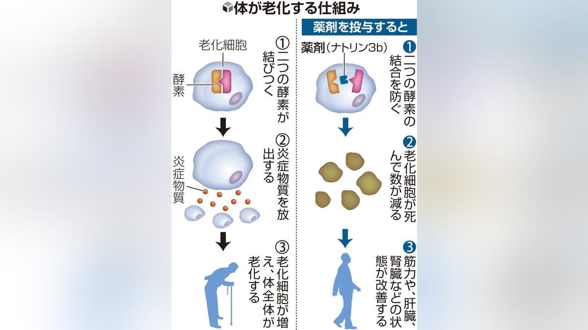 【読売新聞】 老化した細胞を体内から取り除く薬剤をマウスの実験で見つけたと京都大などの研究チームが発表した。副作用はほとんどみられなかったといい、人の臓器や体を若く保つ薬として実用化を目指す。論文が国際科学誌に掲載された。チームは