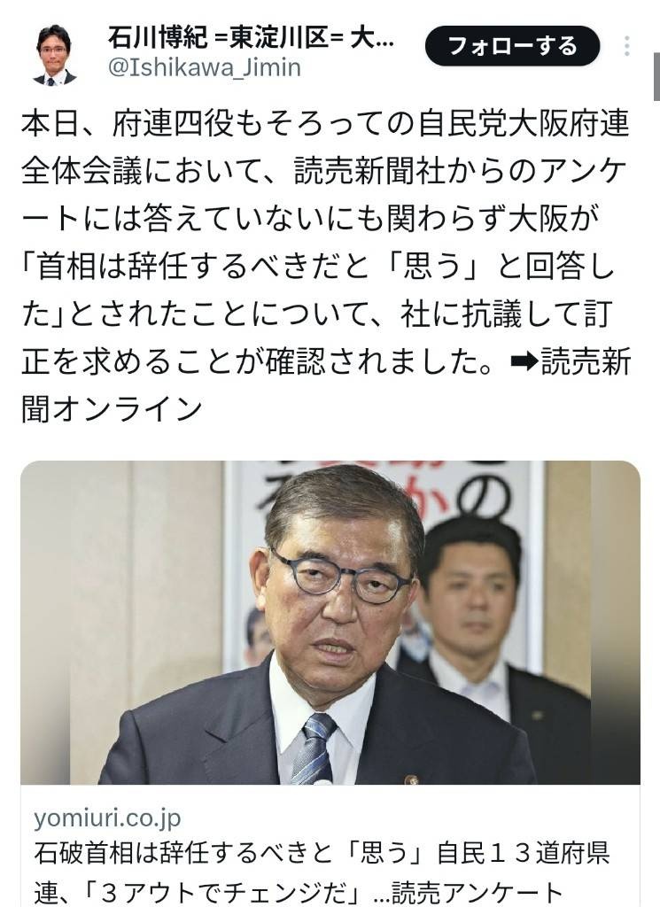 自民党大阪府連「アンケートに答えてもないのに石破辞任派と書かれた」読売新聞、終わる