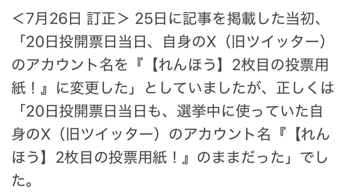 産経新聞は7月27日朝刊で、SNSを使った公職選挙法違反疑惑について報じた記事について、参議院選挙の投開票当日に自身のXのアカウント名を「【れんほう】2枚目の投票用紙!」に変更したと報じたのは誤りで、選挙中に使っていたアカウント名が投開票日もそのままになっていたと訂正した。