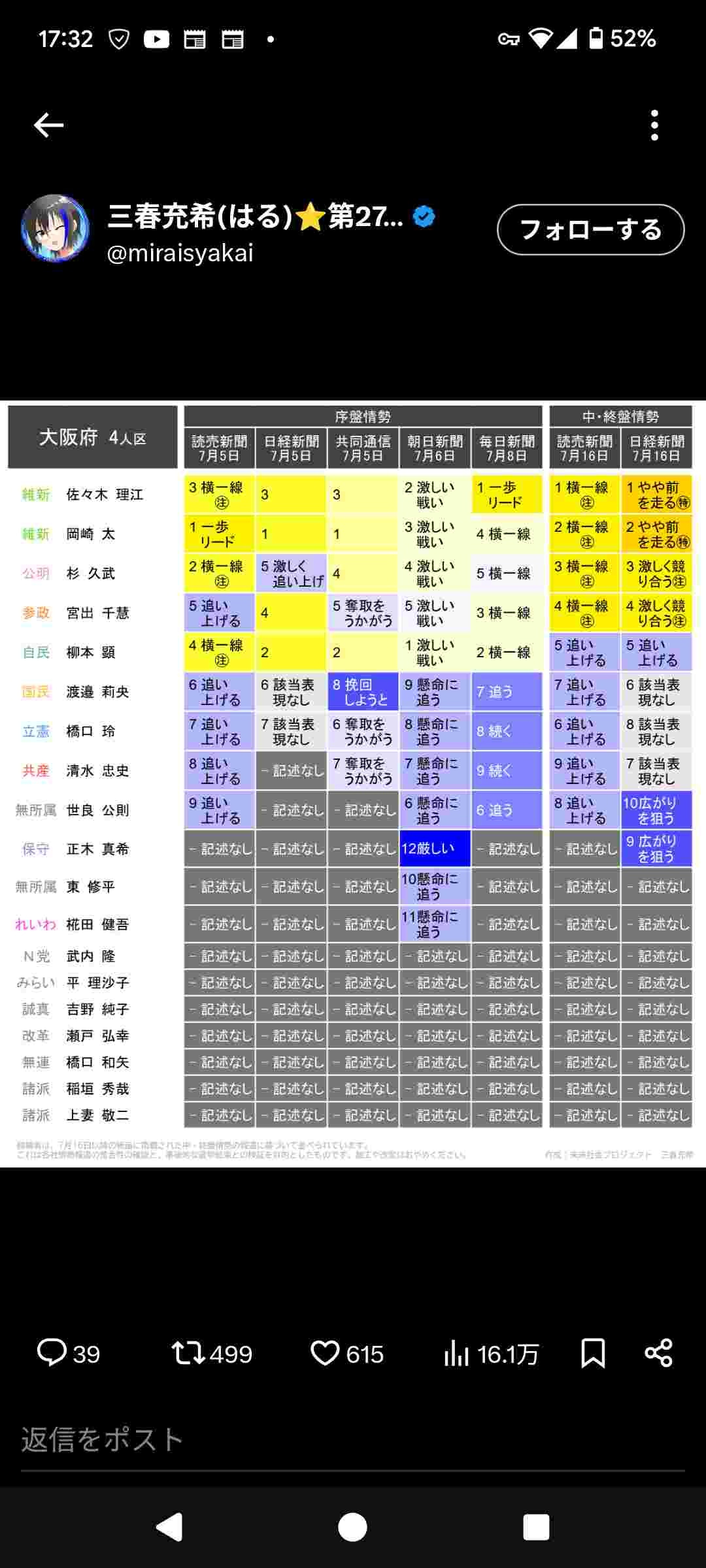 西日本、参政党も自民党も公明党も失速、維新が急激な追い上げ