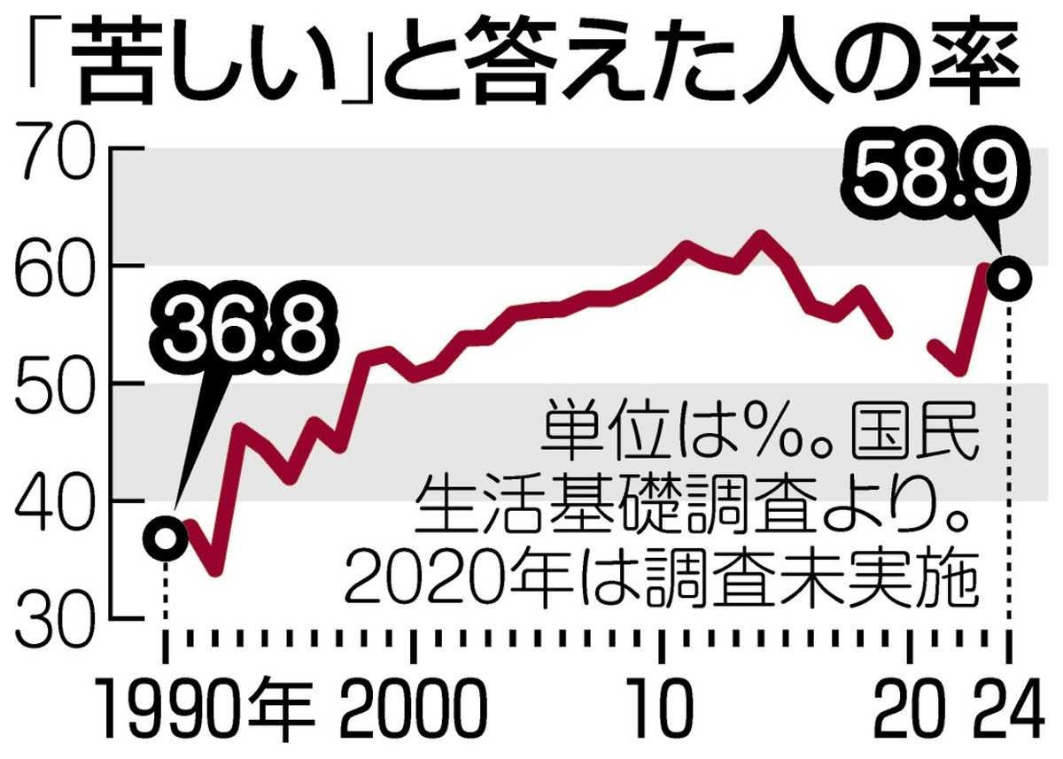 生活意識を尋ねた政府の国民生活基礎調査で「大変苦しい」「やや苦しい」と答えた人は1990年に3割台でしたが、バブル経済が崩壊した91年ごろ以降、比率は上昇。98年に半数を超え、東日本大震災が起きた11年には6割を上回りました。今も6割近くが苦しさを感じています=グラフ。