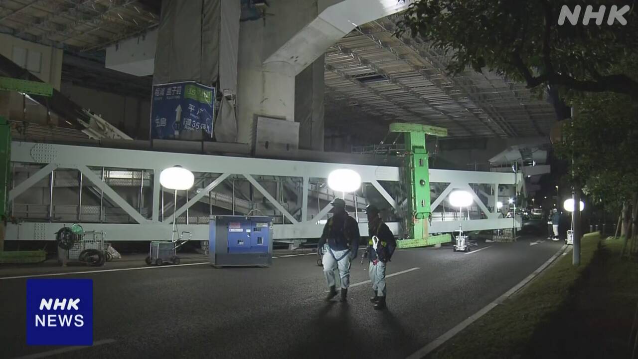 長崎 佐世保 約30m重さおよそ140トンの橋桁運ぶ台車が横転 道路ふさぎ通行止め
